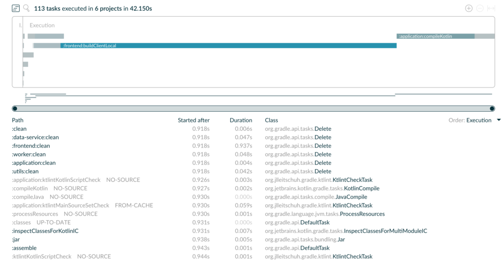 Se, per esempio, uno dei vostri moduli ha bisogno dell’output della build di un altro modulo ma non avete specificato che la sua build dependsOn l’altra, rischiate di trovarvi le build rotte randomicamente: per fortuna, Gradle sa di questa possibilità e mette a disposizione un tool molto bello per debuggare questi casi.